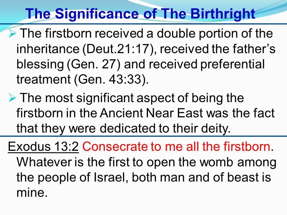 The Bible contains several passages that outline the rights and significance of the firstborn, particularly in the context of inheritance, family leadership, and religious duties. These rights are rooted in both the cultural and legal traditions of ancient Israel, and they are often intertwined with theological themes.