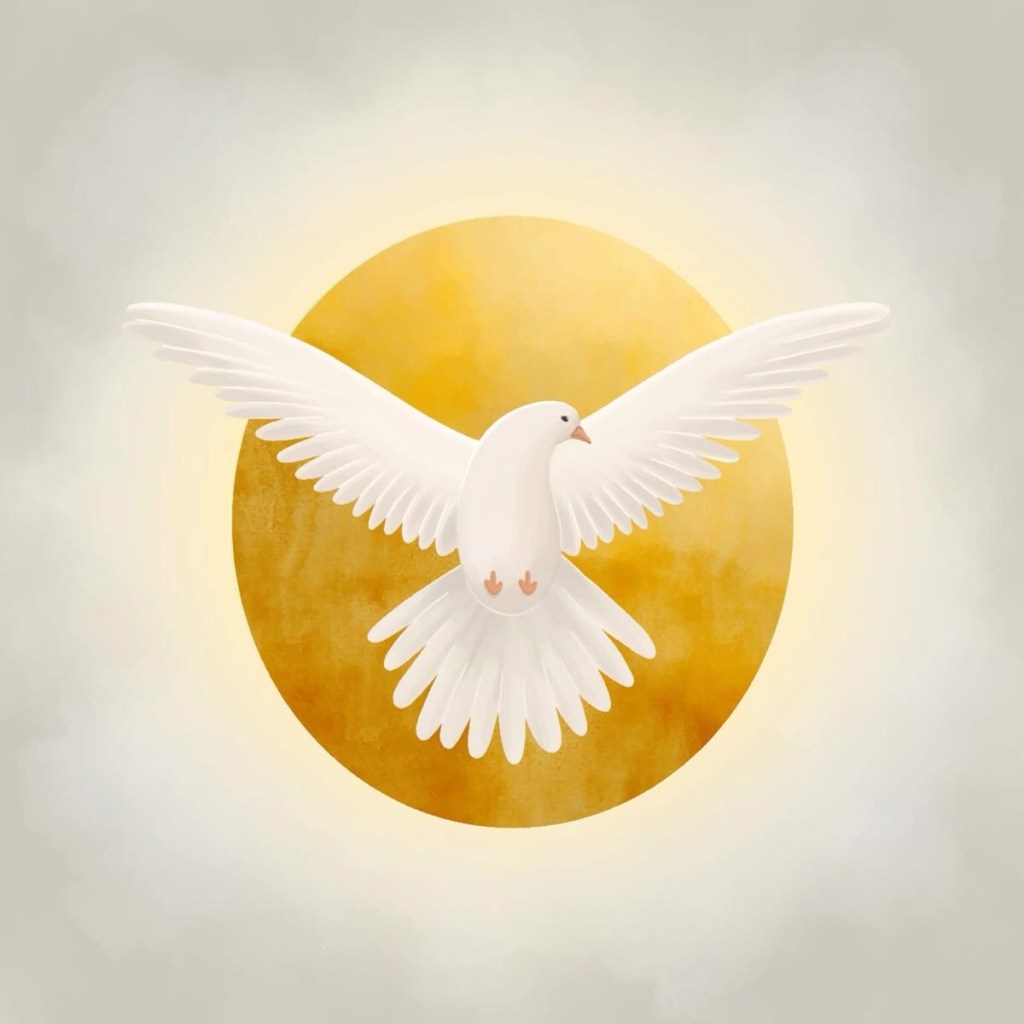 This image depicts a white dove with outstretched wings, flying in front of a golden circle. The dove is a well-known symbol in various traditions: