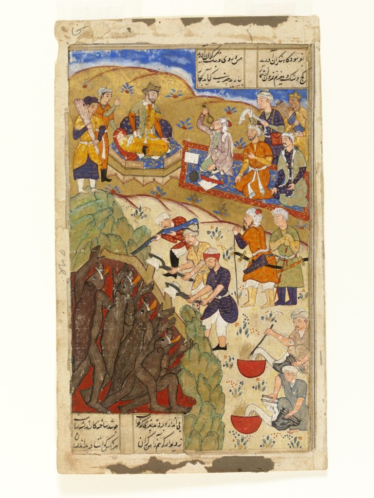 The architectural and artistic style—including Persian calligraphy and iconography—links it to Islamic manuscript illustrations, possibly from a Shahnama (Book of Kings) or a Qisas al-Anbiya’ (Stories of the Prophets) type manuscript.